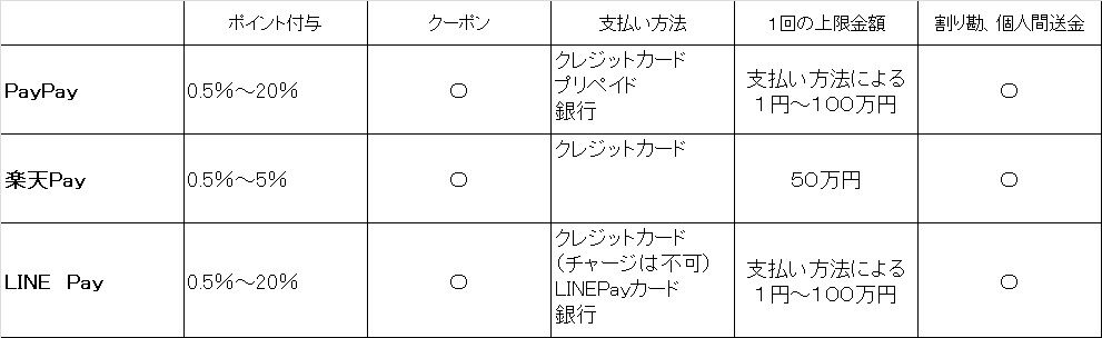 PayPay、楽天Pay、LINEPayの特徴ですが使えるお店やキャンペーン対象が異なります。