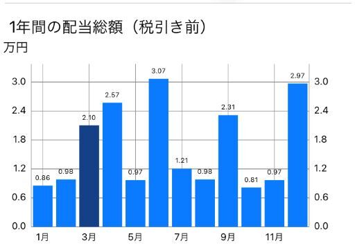 1年間の配当総額(税引き前)こうしてみると月ごとのバラツキがありますね。