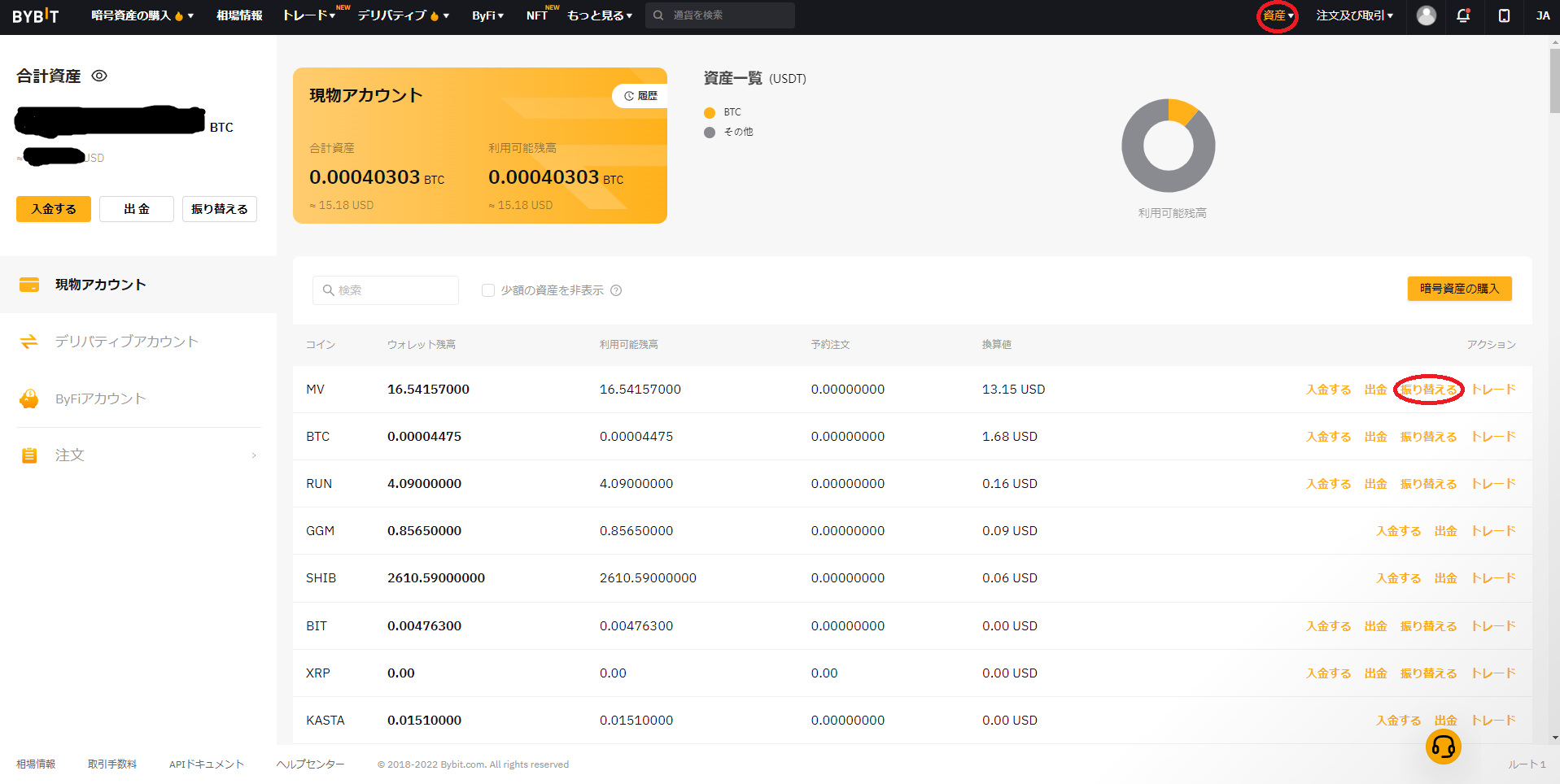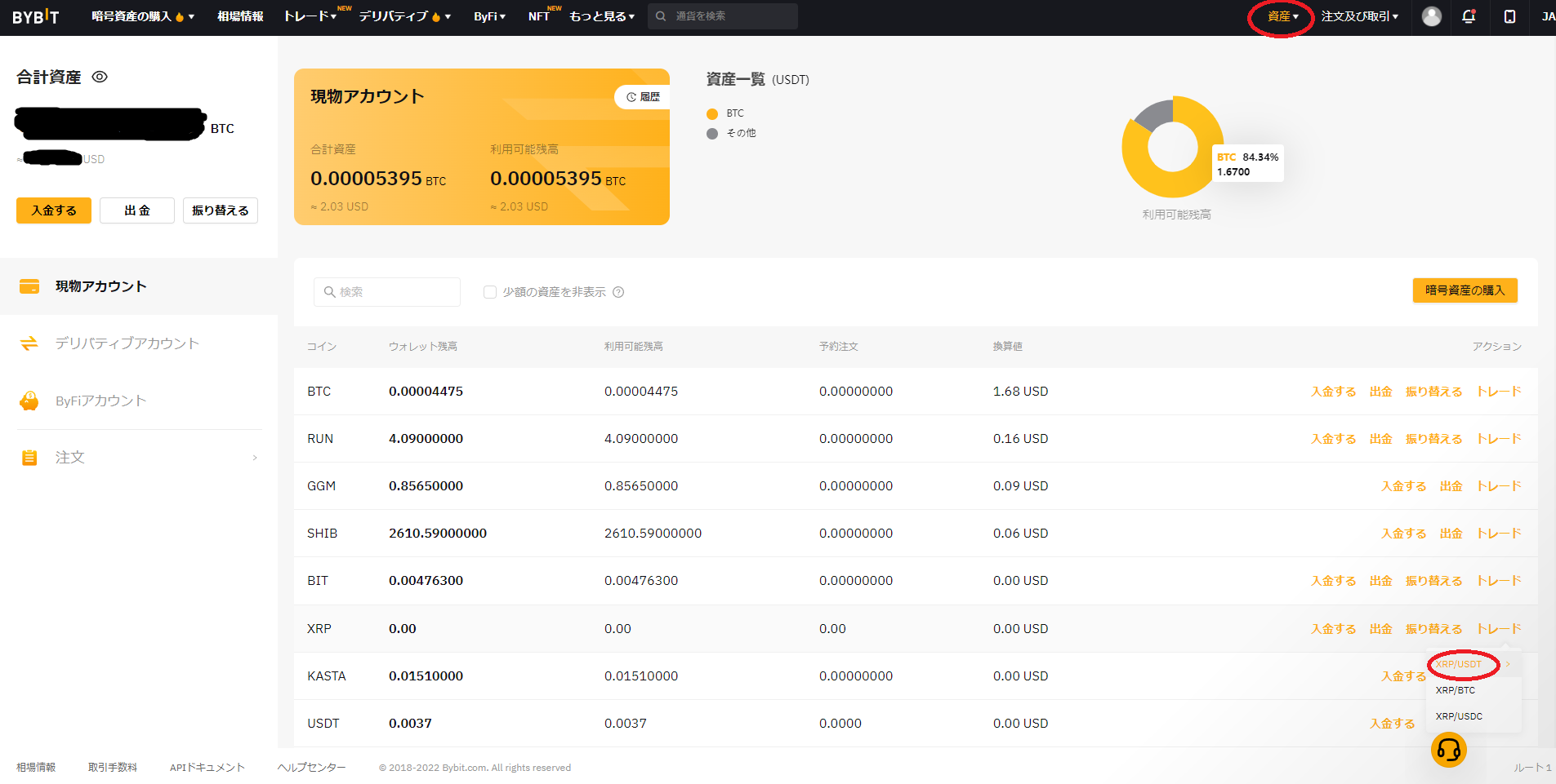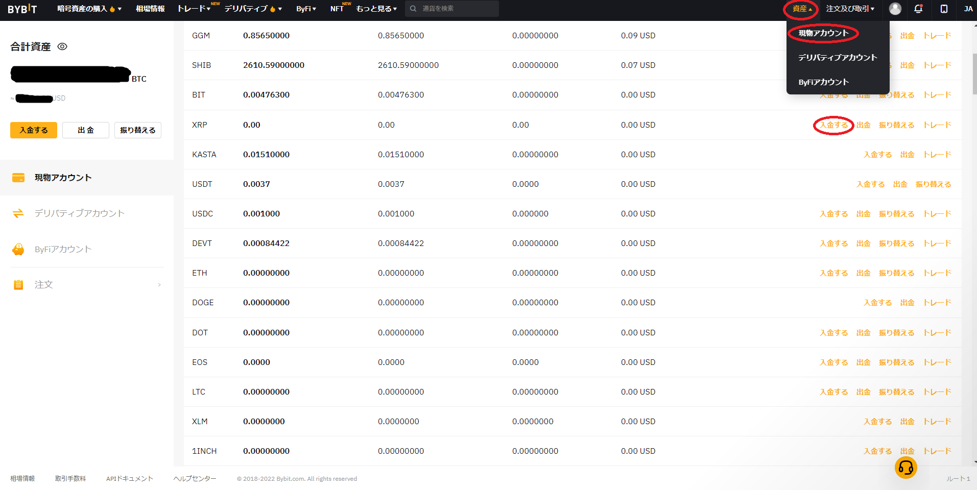 Bybitへログインし、資産タブ→現物アカント→XRPを入金する