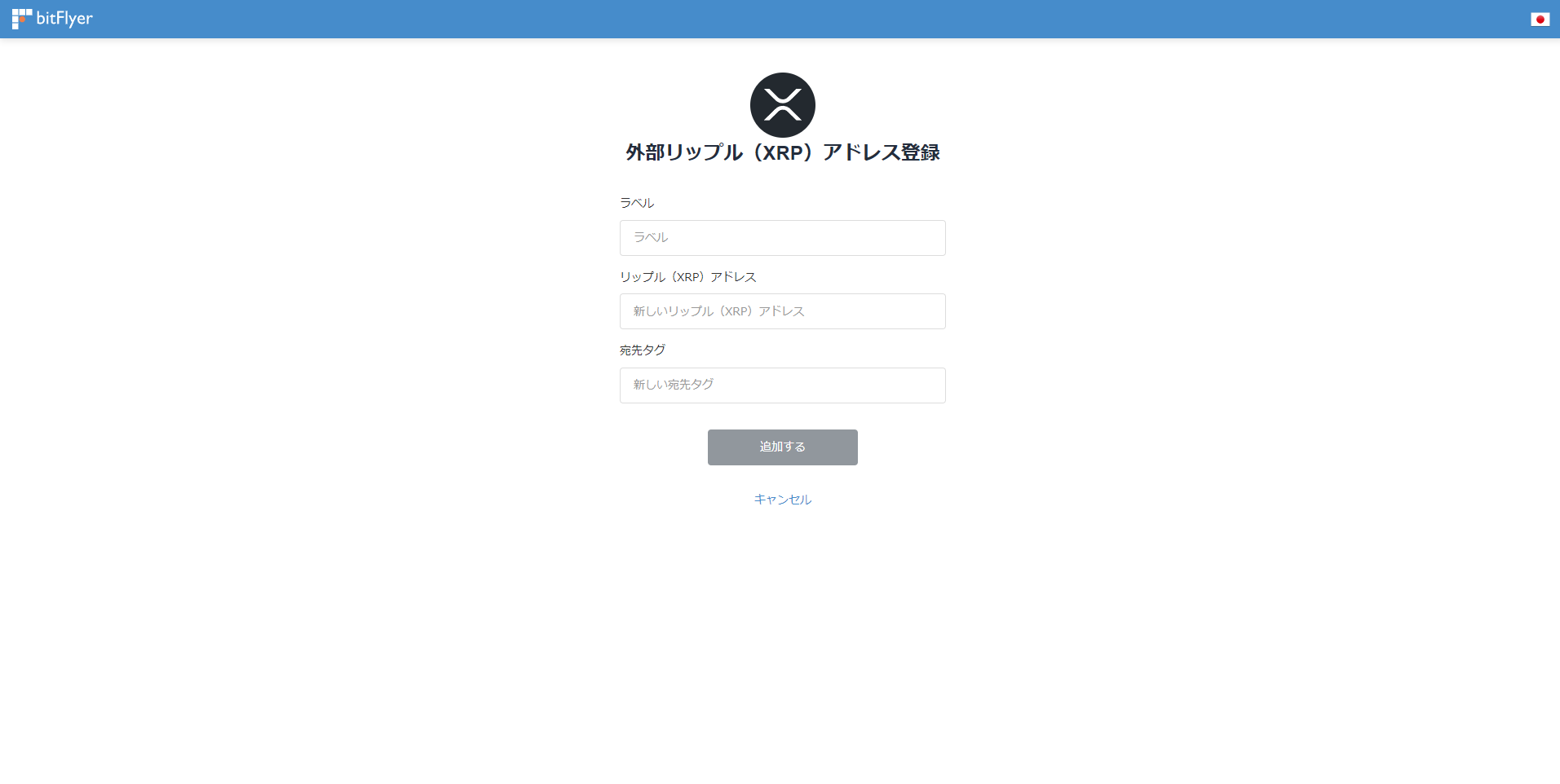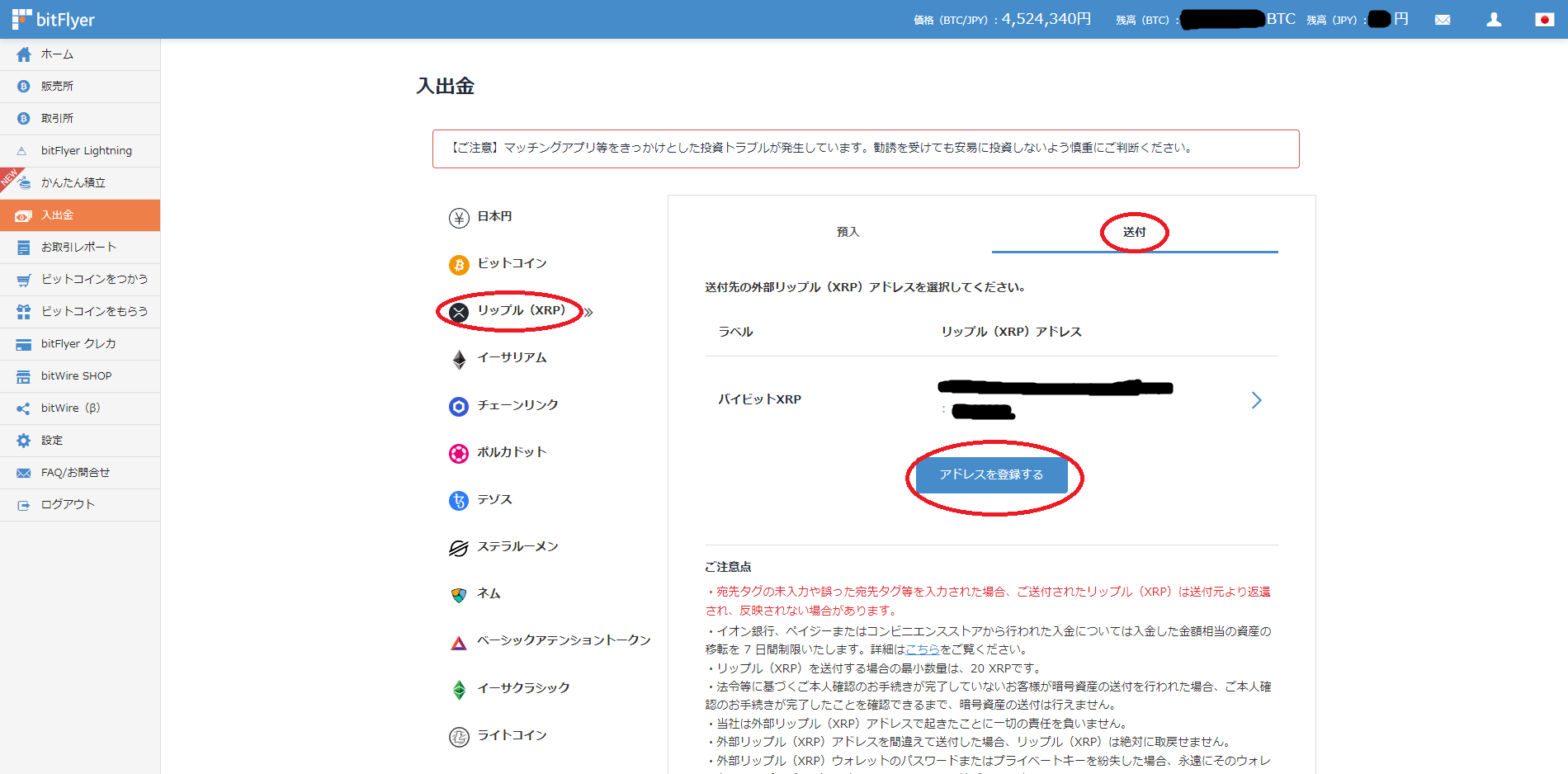 bitFlyerの入出金→リップル(XRP)→送付→アドレスを登録する