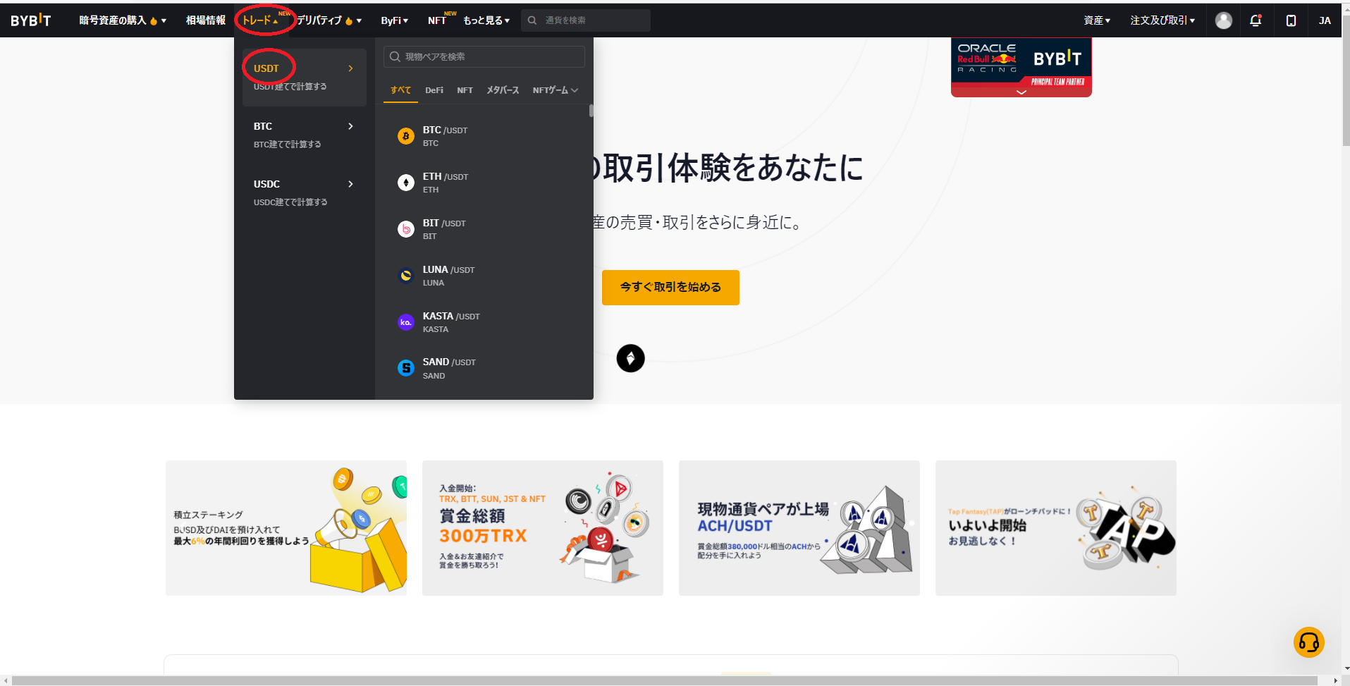 トレードタブよりUSDT選択