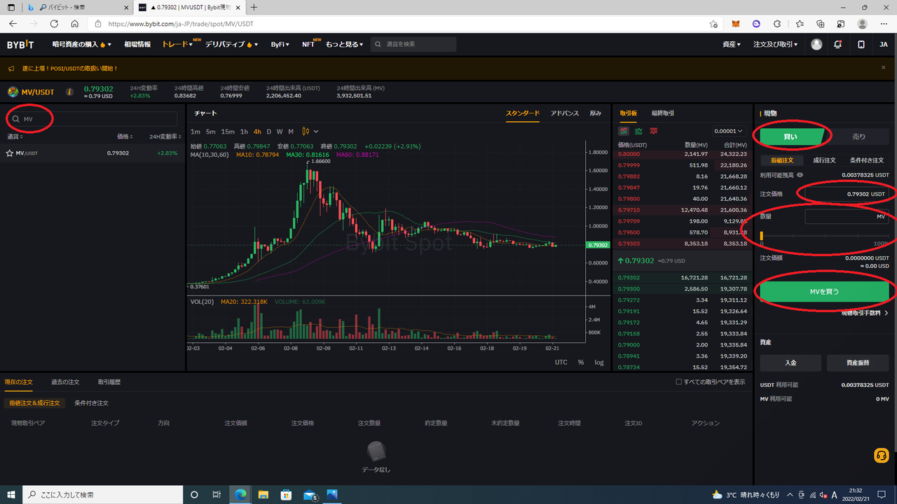 検索欄にMVと入力→買い選択→注文価格入力(取引板クリックでも可)