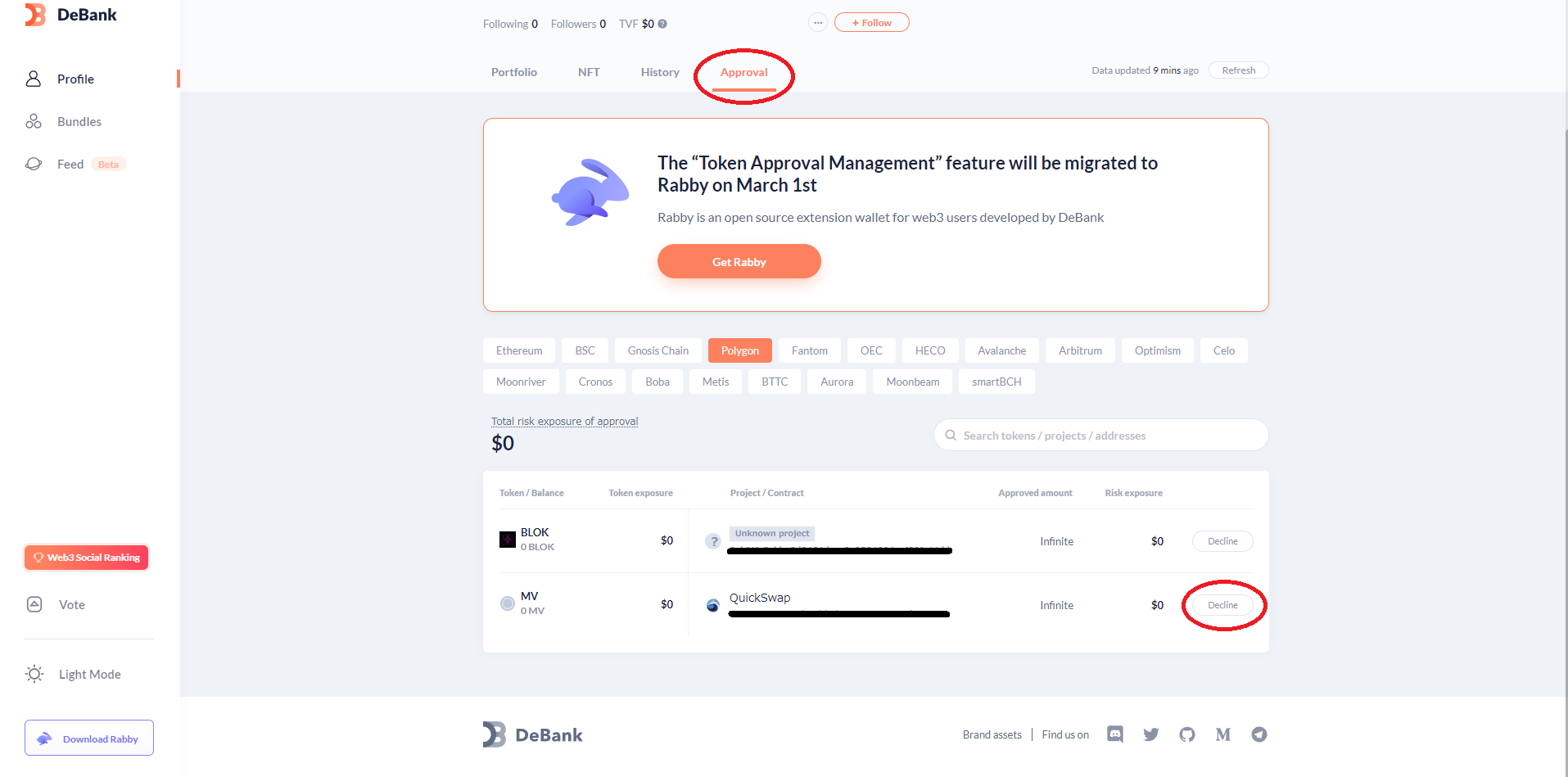 DeBankにて関係しているapproval(承認)をDecline(Cancel Approval)します。