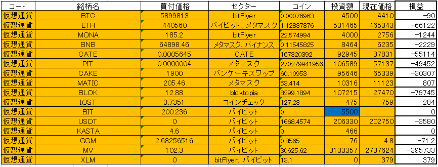 BTCと米株(HMY)を売却したので現金が増えましたね。