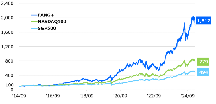 FANG+は約18倍成長しており、その圧倒的なパフォーマンスが
